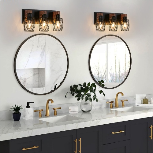 18 Industrial Vintage 3-Light Wall Sconce – Black Cage Wall Lighting Fixture With Wooden Accents For Bathroom, Hallway, Or Living Room Bulb Not Included